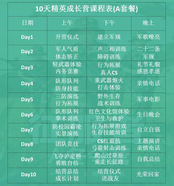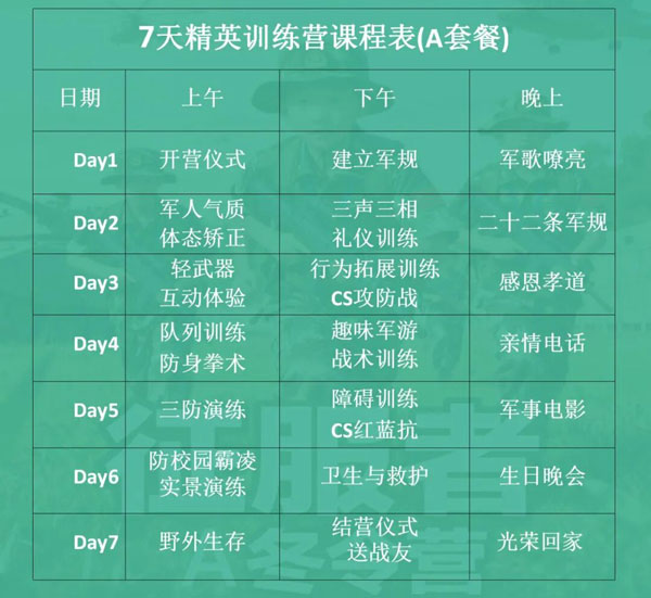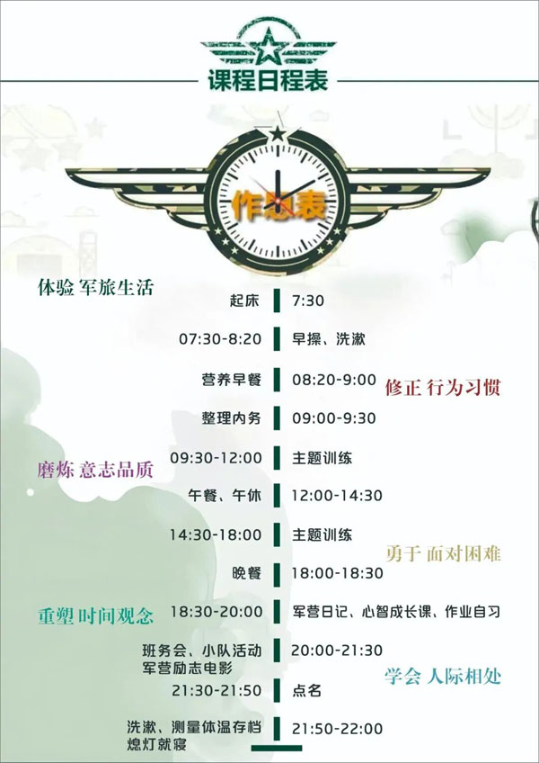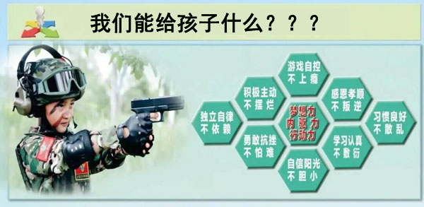 帮助孩子改掉拖沓懒散、自由散漫、专注力差、自控力差等不良习惯;增强体质、锤炼意志,培养孩子独立、坚强、自信、勇敢等优秀军人品格。