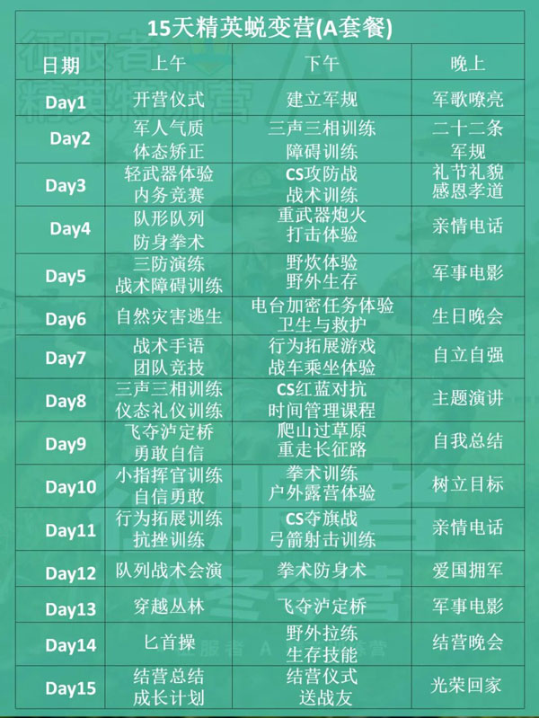 2026征服者冬令营活动须知▌招生对象:6-16岁健康青少年,无癫痫、心脏病、哮喘等不宜运动疾病、精神病、传染病等,家长不得隐瞒真实健康状况。▌活动地址:云南征服者军事特训营昆明基地▌开营时间:7天卓越体验营:2180元/人